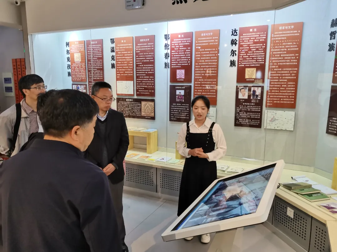 在文学院刘晓霞书记、綦中明院长的陪同下,邬志辉副校长、宋祥副院长一行参观了黑龙江省语言文字馆。文学院本科生李润宇、管悦作为讲解员,结合碑刻和图片,首先介绍了我国语言文字发展的历史进程,然后重点讲解了我院开展的黑龙江语言文字田野调查工作和学术成果。邬志辉校长对我院的语言文字工作做出高度评价。